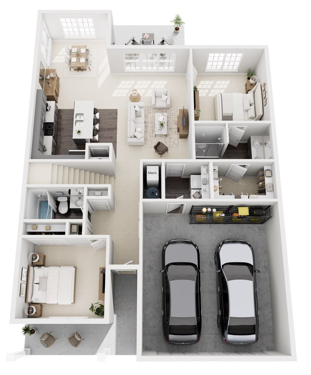 - Private 2-car garage and driveway for direct home access, plus front porch and secluded rear patio